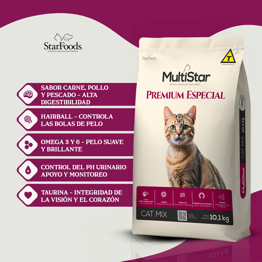 Harina de Carne de Pollo, Harina de Carne Y Huesos de Res, Arroz en Grano, Maíz Molido, Harina de Gluten de Maíz 60, Sorgo en Grano, Trigo Integral, Avena en Grano, Pulpa de Remolacha, Afre de Aveia, Semilla de Psyllium (Min. 1,35%), Levadura de Cerveza Inactivada Deshidratada, Aceite de Pollo, Aceite de Pescado, Hemoglobina, Palatabilizante (Hidrolizado de Hígado de Aves Y Cerdos), Cloruro de Sodio, Cloruro de Potasio, Fosfato Dicálcico, Prebióticos (Mos Y Β-Glucanos), Dl-Metionina, L-Lisina, Taurina, L-Carnitina, Sulfato de Condroitina, Sulfato de Glucosamina, Vitaminas: A, D, E, K3, B1, B2, B6, B12, Ácido Fólico, Ácido Pantoténico, Biotina, Cloruro de Colina, Niacina, Minerales: Yodato de Calcio, Selenito de Sodio, Sulfato de Cobre, Sulfato de Hierro, Sulfato de Manganeso, Sulfato de Zinc, Extracto de Yucca, Ácido Propiónico, Antioxidante (Bha), Zeolita (0,1%).