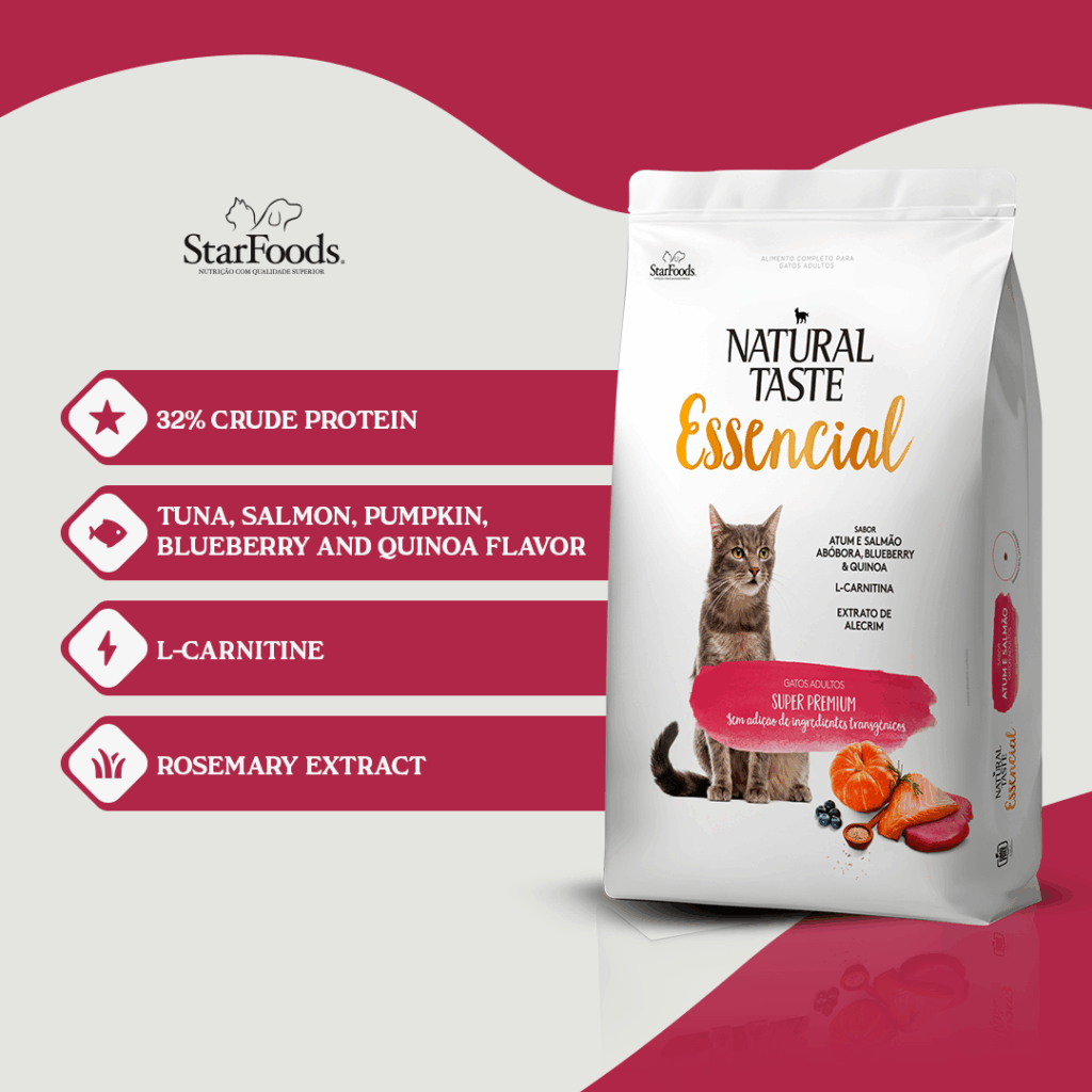 Fish meal (Tuna and salmon), Low ash poultry by-product meal, Poultry by-product meal, Egg powder, Rice grain, Sorghum grain, Whole wheat, Dehydrated pumpkin, Oat grain, Flaxseed grain (1%), Quinoa grain, Lignocellulose, Beet pulp, Pea fiber, Psyllium seed, Dehydrated inactivated brewer’s yeast, Chicken fat, Salmon oil, Flavoring agent (Poultry and pork liver hydrolyzate), Blueberry extract (Blueberry), Sodium chloride, Potassium chloride, Dicalcium phosphate, Prebiotics (Mos, Fos and β-Glucans), L-Carnitine, Dl-Methionine, L-Lysine, Taurine, Vitamins A, C, D, E, K3, B1, B2, B6, B12, Folic acid, biotin, choline chloride, niacin, calcium pantothenate, minerals: calcium iodate, sodium selenite, copper sulfate, iron sulfate, manganese sulfate, zinc sulfate, chelated selenium, chelated zinc, acidity regulator, natural antioxidant (concentrated tocopherols and rosemary extract), yucca extract, propionic acid, zeolite.